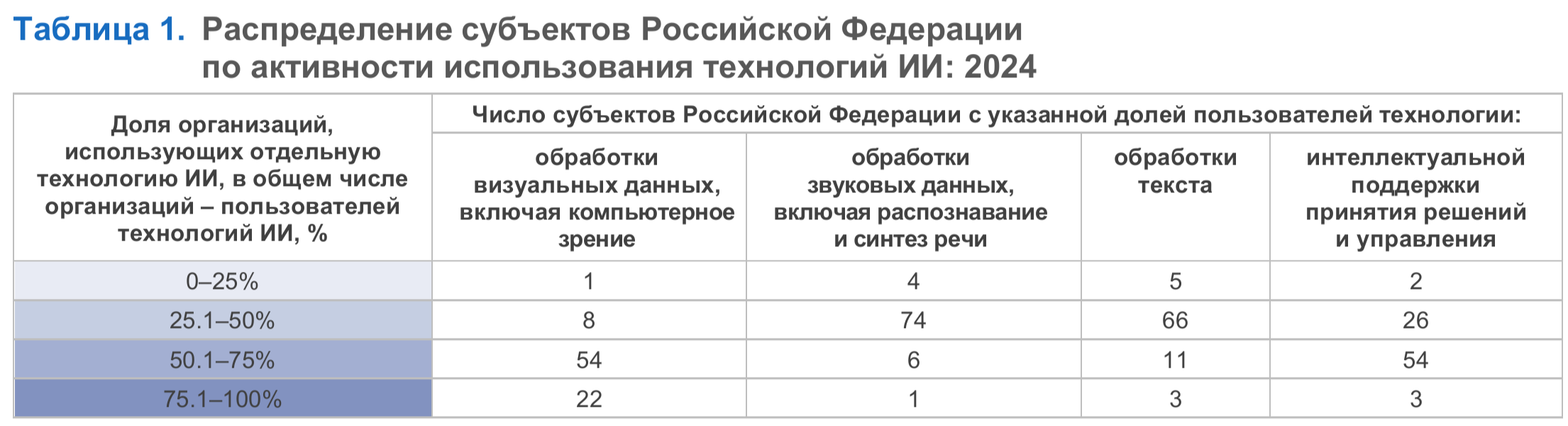Самая низкая степень распространения у технологий обработки звуковых данных — они активно применяются пользователями ИИ лишь в семи регионах страны.