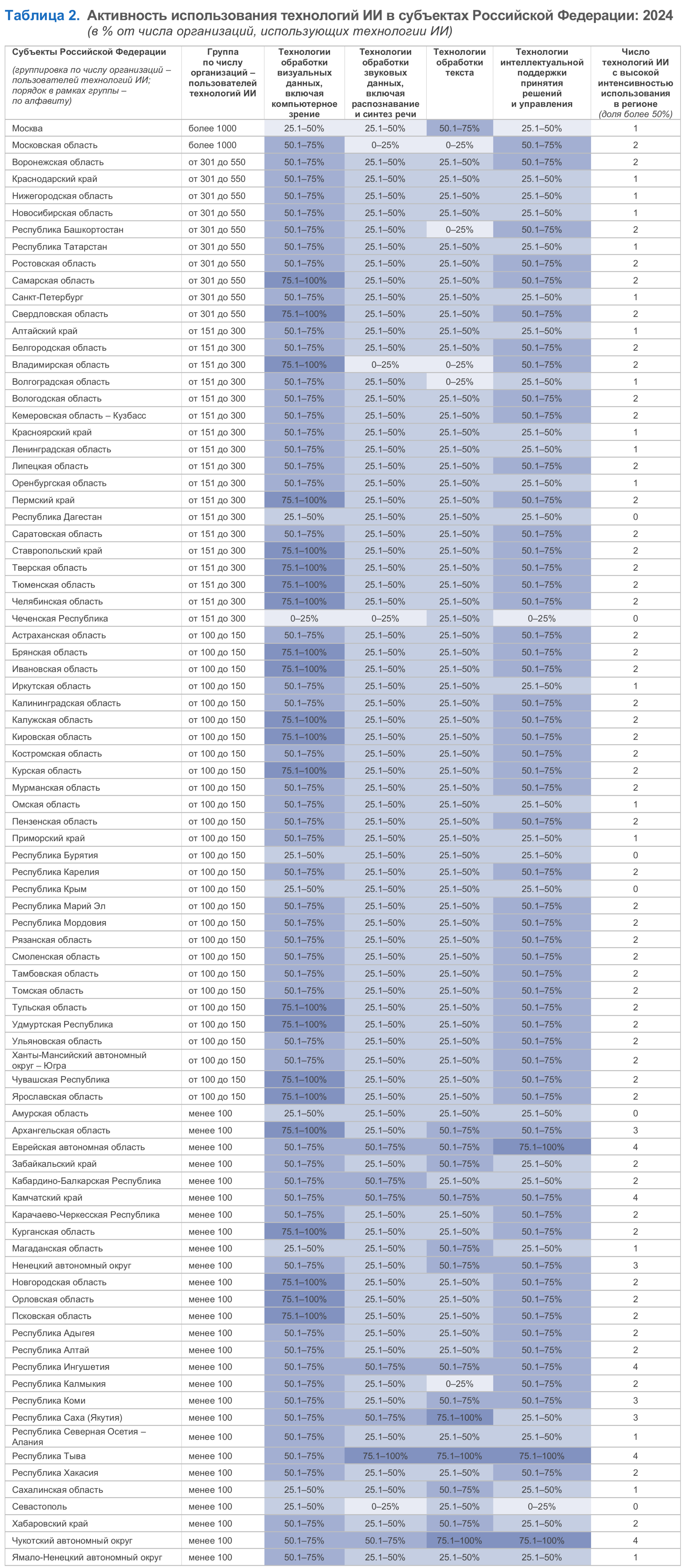 Институт статистических исследований и экономики знаний НИУ ВШЭ в рамках изучения распространения технологий искусственного интеллекта анализирует особенности использования ИИ в регионах страны по итогам 2024 г. Оценки базируются на данных обследования свыше 15 тыс. крупных и средних организаций — пользователей ИИ, проведенного в 2025 г. Росстатом по методологии ИСИЭЗ НИУ ВШЭ.